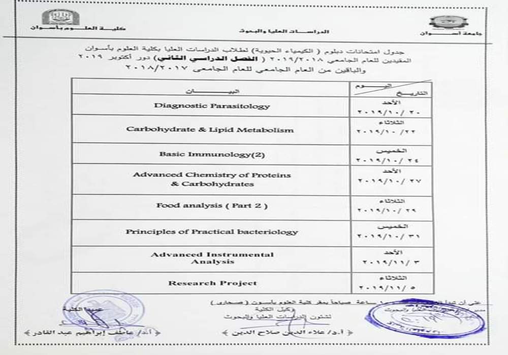 جدول إمتحانات دبلوم ( الكيمياء الحيوية ) لطلاب الدراسات العليا September 16, 2019September 17, 2019 Asmaanewsتم الإعلان عن جدول إمتحانات دبلوم الكيمياء الحيوية اقرأ المزيد