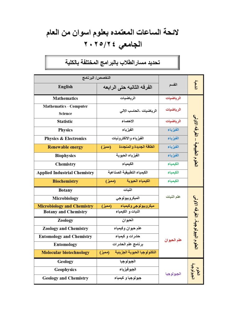 ( أ ) تعتمد الدراسة بكلية العلوم جامعة أســــــــــــــــوان على نظام الساعات المعتمدة و تمنح جامعة أســـــــوان بناء علي طلب مجلس كلية العلوم درجة البكالوريوس في العلوم  Bachelor’s Degree in Science (B.Sc.) في احد البرامج الاتية :