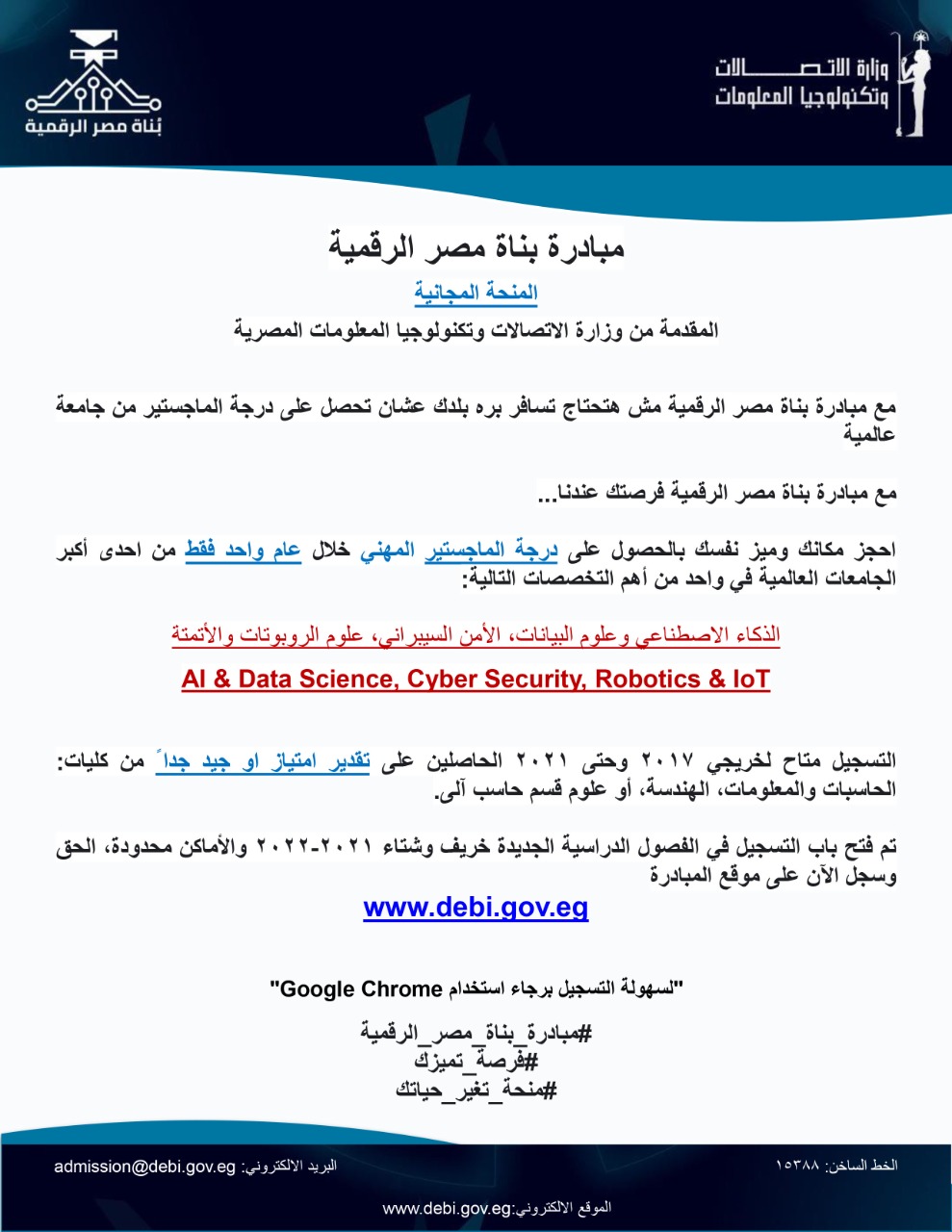 Ministry of Communication and information technology announces the training initiative “Digital Egypt Builders to train graduates in cooperation with global companies to obtain the professional Master degree within one year from one of the international Universities in the following specialties: Artificial intelligence, Data Science, cybersecurity, robotics and automation sciences, registration is available for graduates of 2017 to 2021 who evaluated as “Excellent” or “very good” for more details, enter on the following link: