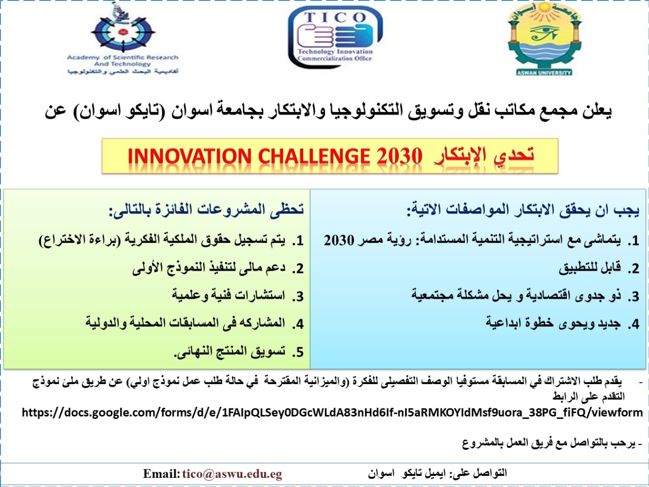 قال الأستاذ الدكتور أحمد غلاب محمد رئيس جامعة أسوان أن (تايكو أسوان )، يعلن عن مسابقة تحدي الابتكار 2030 وذلك بالتعاون وتحت رعاية الدكتور أحمد غلاب رئيس الجامعة ورعاية الدكتور محمود صقر ، رئيس أكاديمية البحث العلمي و التكنولوجيا و تحت إشراف الدكتور أيمن عثمان، نائب رئيس جامعة أسوان للدراسات العليا والبحوث و الدكتور عمرو فاروق ، نائب رئيس أكاديمية البحث العلمي و التكنولوجيا و الدكتورة وفاء عبدالرشيد، المشرف على مكاتب دعم الابتكار و نقل التكنولوجيا بجمهورية مصر العربية و بتنفيذ الفريق التنفيذي لمجمع مكاتب نقل و تسويق التكنولوجيا و الابتكار بجامعة أسوان (تايكو أسوان ) والذي يعلن عن مسابقة تحدي الابتكار 2030 Innovation challenge. و ذلك لمواجهة أهم التحديات المجتمعية و التكنولوجيا و الصناعية تماشيا مع رؤية مصر للتنمية المستدامة 2030.