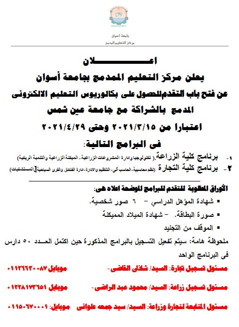 يعلن مركز التعليم المدمج بجامعة أسوان عن فتح باب التقديم للحصول علي بكالوريوس التعليم الإلكتروني