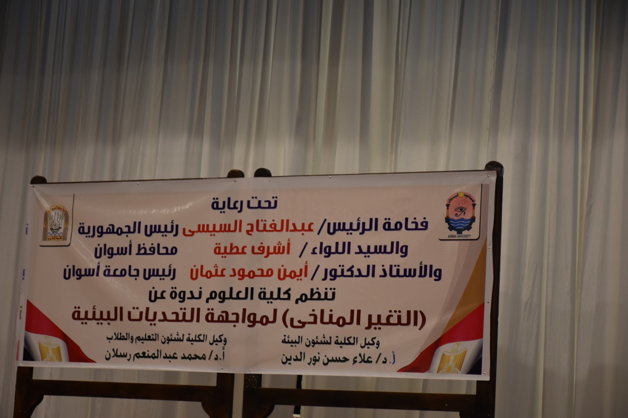 شهد اليوم الثلاثاء الأستاذ الدكتور/ أيمن محمود عثمان _ رئيس جامعة أسوان فاعليات ندوة علمية نظمتها كلية العلوم بقاعة المشير طنطاوي تحت عنوان ” التغير المناخي” وذلك تحت رعاية اللواء أشرف عطية محافظ أسوان وبمشاركة جهاز شئون البيئة بالمحافظة والأكاديمية العربية للعلوم والتكنولوجيا والنقل البحري بأسوان، وذلك بحضور الأستاذ الدكتور / محمد عبدالمنعم رسلان _وكيل كلية العلوم لشئون التعليم والطلاب والأستاذ الدكتور / علاء حسن نور الدين _ وكيل الكلية لخدمة المجتمع وتنمية، البيئة والأستاذ الدكتور/ ممدوح السيد _ مدير عام الفرع الاقليمي بجهازشئون البيئة وذلك بحضور محاضرة نخبة من علماء كلية العلوم الاستاذ الدكتور / محمد نجيب راشد والدكتور عصام شعلان والأستاذ الدكتور /حسن خزيم ونرمين فليب _ مديرمعامل فرع أسوان لجهاز شئون البيئة وشهدت الندوة حضوراً كثيفاً من طلاب الجامعة.